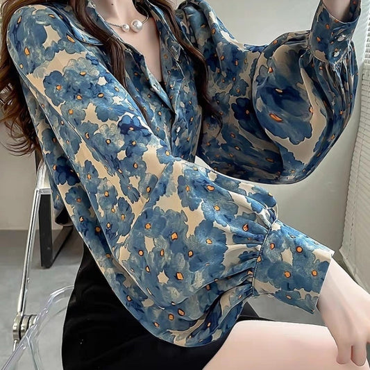 Women's Slimming Floral Top with Lantern Sleeves – Elegant Temperament Blouse